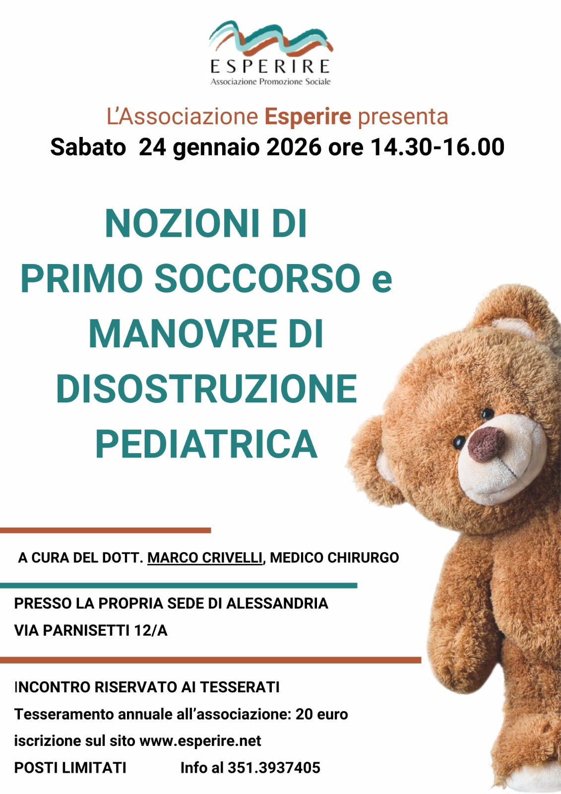 Un incontro pensato per genitori e caregiver, in cui si parlerà di primo soccorso pediatrico in modo semplice e concreto.